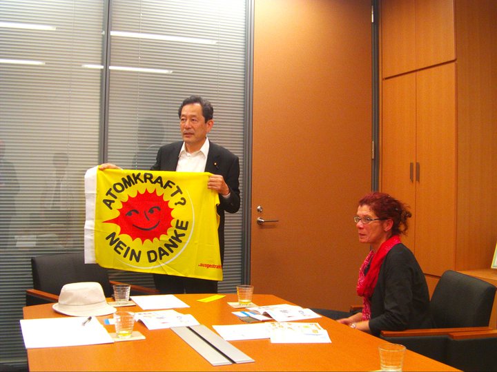 In dieser scheinbaren Randnotiz zeigt sich die Tragweite des Umbruchs, den dieses Land gerade durchlebt. Später habe ich ein spannendes Gespräch mit dem Unterhausabgeordneten Herrn Hattori. Er ist Sprecher der sozialdemokratischen Abgeordneten gegen Atomkraft. Seine Partei hat ein Konzept vorgelegt, bis 2020 in Japan gänzlich aus der Atomkraft auszusteigen. Ein kühner Plan, wenn man bedenkt, dass Japan bis zum Fukushima-Gau am 11.3. dieses Jahres 57 AKW am Netz hatte! Die Fragen, die ich mit Herrn Hattori bespreche, stellen sich in Japan kaum anders als in Europa: Wie die Macht der Stromkonzerne begrenzen? Wie für einen sinnvollen Netzausbau sorgen? Wie sicherstellen, dass die Energieversorgung sozial verträglich gestaltet wird? Wir sind uns einig, dass wir als Politiker gegen die Atommafia nur zusammen mit der außerparlamentarischen Bewegung etwas erreichen können. Ich habe Herrn Hattori eine deutsche „Atomkraft? Nein danke!“-Fahne mitgebracht, die nun seine Bürotür schmückt.